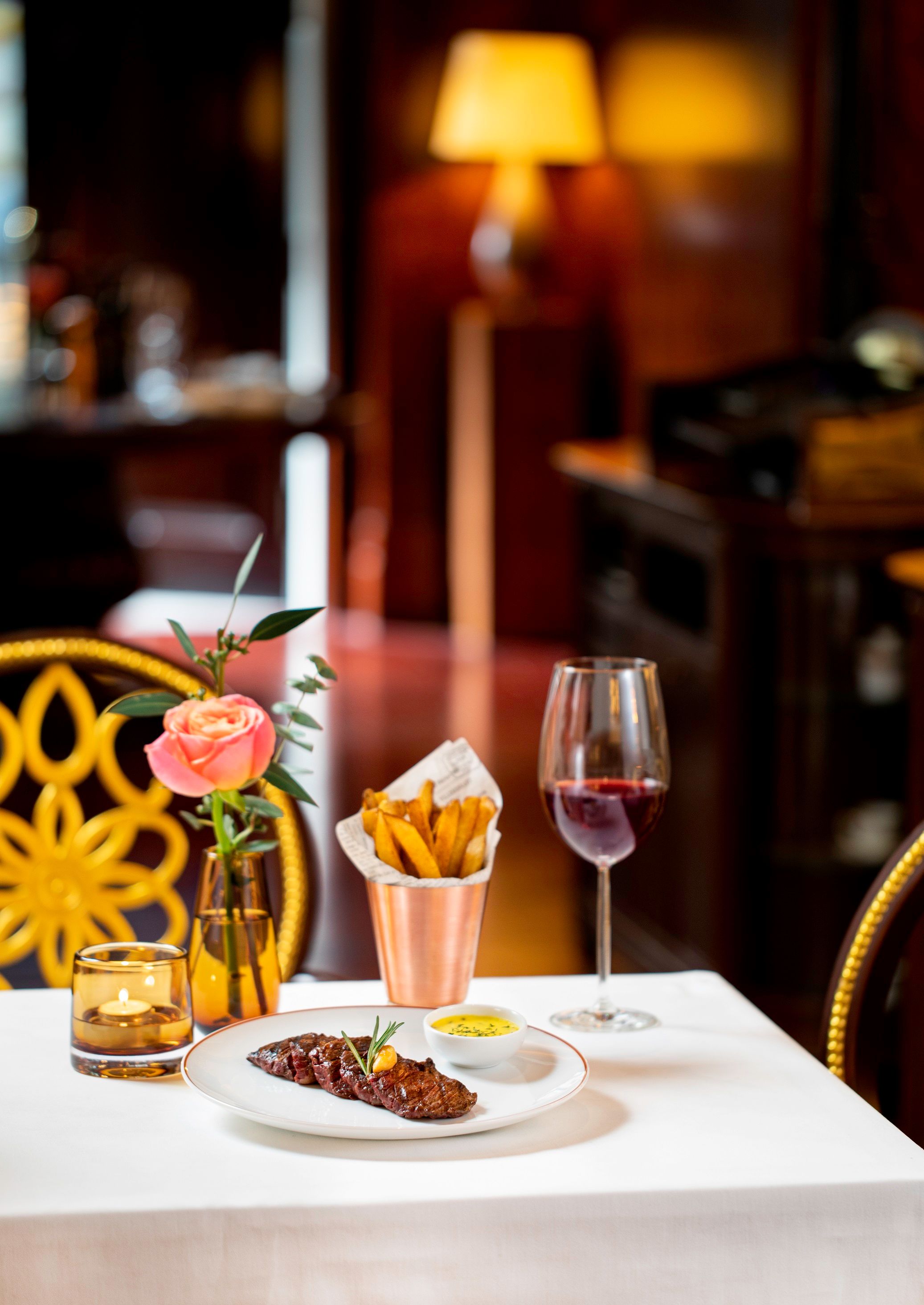“Vol-au-Vent”, a traditional French delicacy once served only to the royalty and now a classic of cuisine bourgeoise, is served at Aux Beaux Arts with a luscious elevation. Inside the rounded fluffy case of puff pastry are foie gras, fresh lobster meat and seasonal greens, all soaked in a rich lobster sauce to bring out the most heavenly flavors from both the land and the sea. The time-honored classic Parisian “Steak Frites” with Bearnaise Sauce, another staple found at all brasseries in France, is recreated here by combining perfectly grilled skirt steak, chosen for its lean cut with bursting flavors suitable for a French butchery standard, with homemade bearnaise and French fries.
