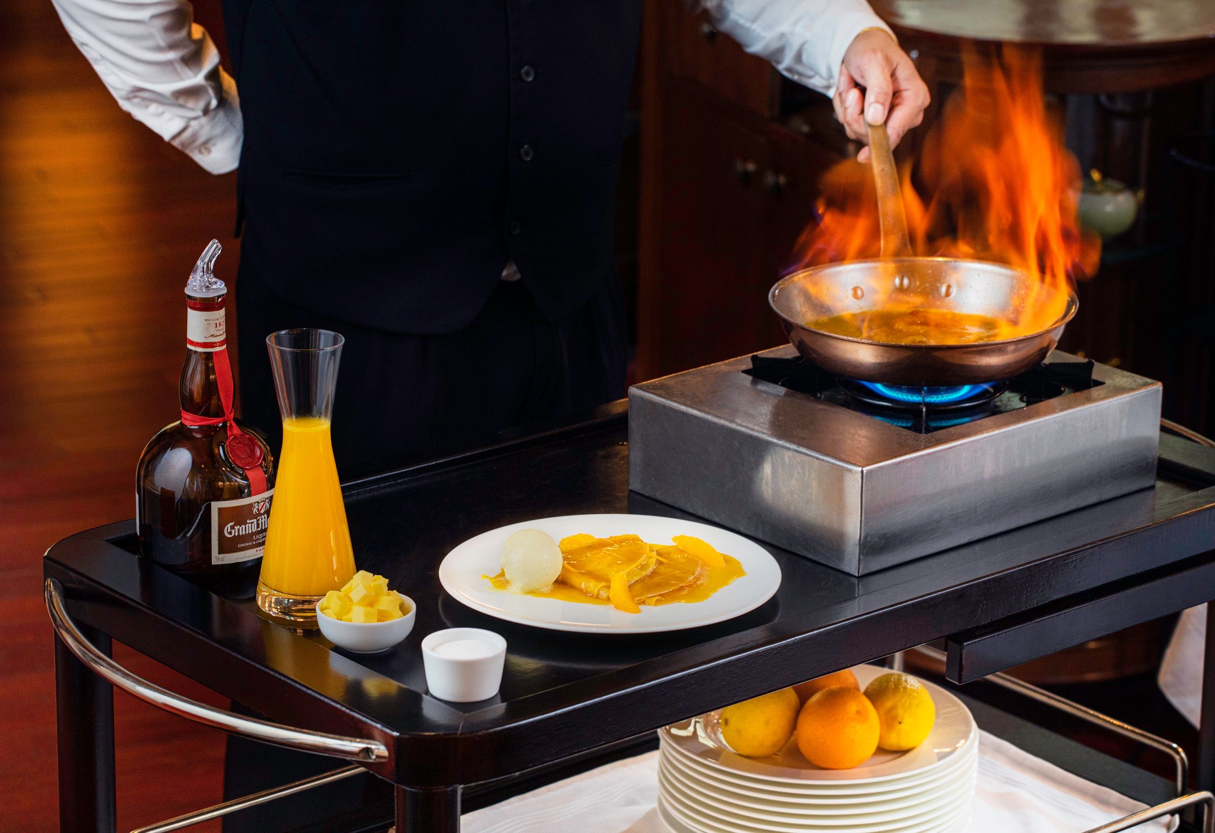 Towards the end of the meal, the restaurant is infused with a sweet, buttery aroma from the showstopper “Crêpes Suzette”, a retro signature of Aux Beaux Arts that is flambé tableside. Nothing concludes an extravagant meal than these classic crêpes coated in a warm, velvety caramel sauce and finished with a shower of citrus zesting.
