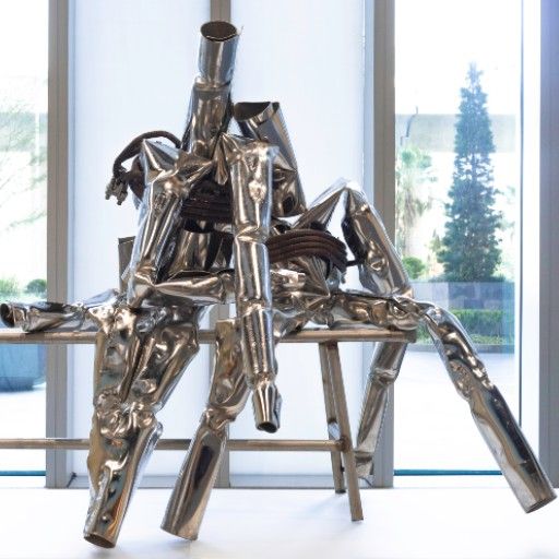 ประติมากรรมสเตนเลสสตีล – Floating Gallery ในผลงานสเตนเลสสตีลจูหมิงบิดและม้วนแผ่นสเตนเลสสตีลจนเกิดความรู้สึกผสมผสานระหว่างความแข็งและความอ่อน เหมือนกับลักษณะของประติมากรรมไม้