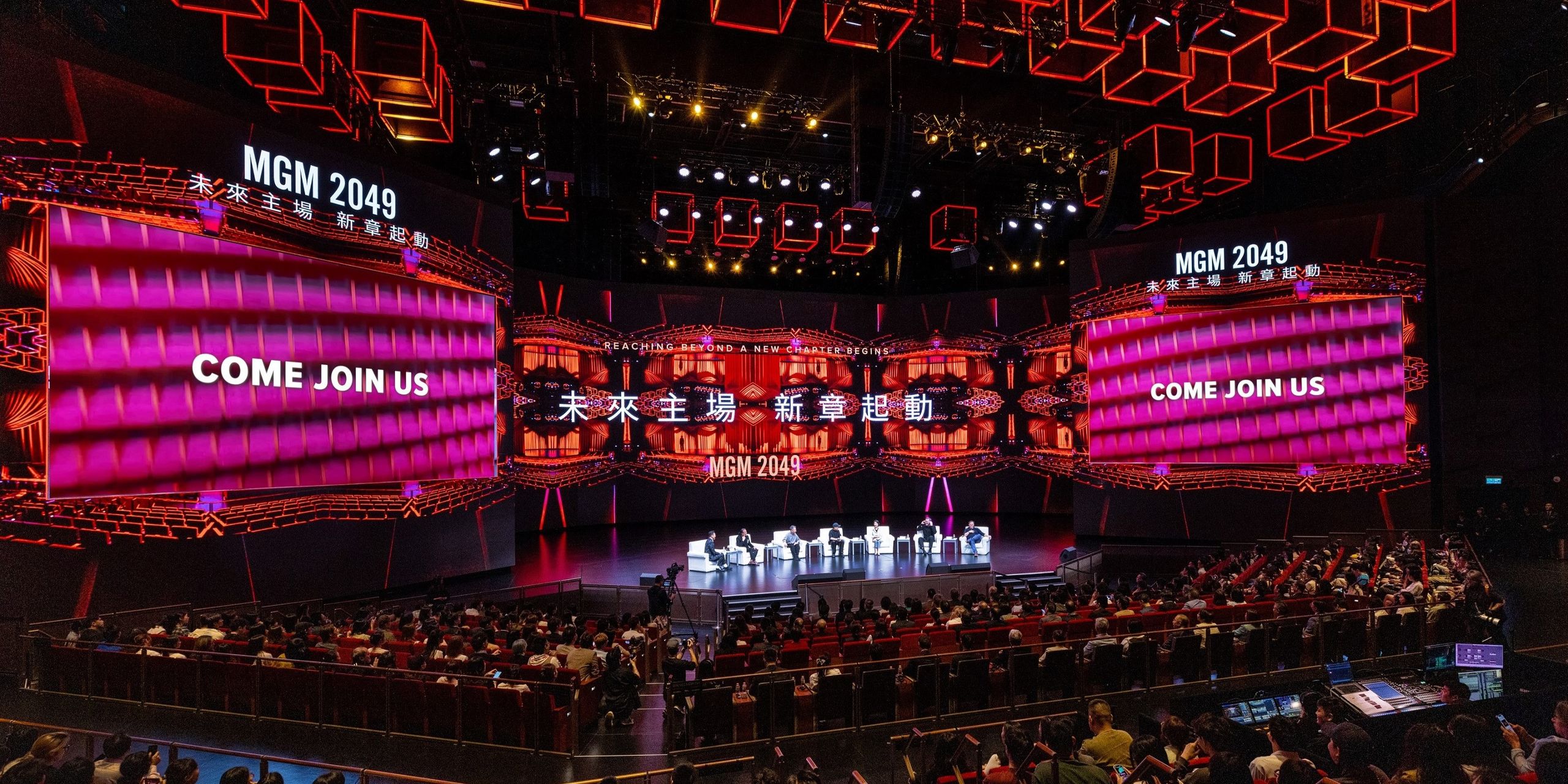 "MGM 2049: Symposium and Global Recruitment Program Kick-off Ceremony" took place tonight at the MGM Theater. Speakers at the symposium included Pansy Ho, Chairperson and Executive Director of MGM China Holdings Limited; Zhang Yimou, Chief Director of MGM 2049; Wu Tong, Music Director of MGM 2049 & Crossover Musician; Sang Jijia, Dance Director of MGM 2049 & Resident Choreographer of City Contemporary Dance Company in Hong Kong; Dominic Faraway, Visual Director of MGM 2049 & Independent Visual Designer; and Bernard Prentice, Underwater DP of MGM 2049 & Underwater Filming Expert. From the perspectives of cultural tourism and stage design, the speakers delved into the concept and vision of this residency show. Besides, MGM launched the "Global Recruitment Kick-off Ceremony" to officially open over 200 positions for global candidates. The on-the-job training opportunities cover several areas, including actors, dancers, art directors, cast managers, performance managers, theater technicians, and so on.