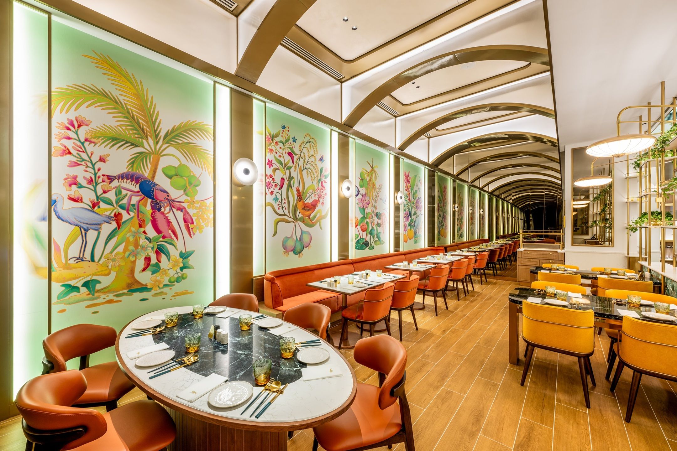 To enrich the cultural narrative of the space, the restaurant features four bespoke paintings by Singaporean artist Tan Zi Xi, each celebrating a signature dish, including Singapore Mandarin Chicken Rice, Lobster Laksa, Singapore Chicken Curry, and Signature Coconut Ice Cream. The compositions also weave in symbolic elements from Macau’s serene wetlands, such as the lotus flower and the black‑faced spoonbill, creating a unique visual fusion where Singaporean flavors and Macau’s characteristics intertwine.